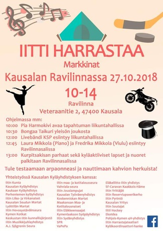 27.10.2018 nähtiin Kausalan Ravilinnassa yli 30:n iittiläisen yhdistyksen upea yhteistyön tulos, Iitti Harrastaa -tapahtuma. Kyseessä oli siis Kausalan Kyläyhdistyksen käyntiin polkaisemat yhdistysmarkkinat, jonka tarkoituksena oli esitellä ja markkinoida Iitin kunnan asukkaille ja toki muillekin yhdistysten järjestämiä tapahtumia sekä yhdistystoimintaa harrastusmahdollisuutena. Lisäksi ajatuksena oli saattaa yhteen yhdistystoimijoita verkostoitumisen ja paikallisen yhteistyön edistämiseksi ja lisäämiseksi.